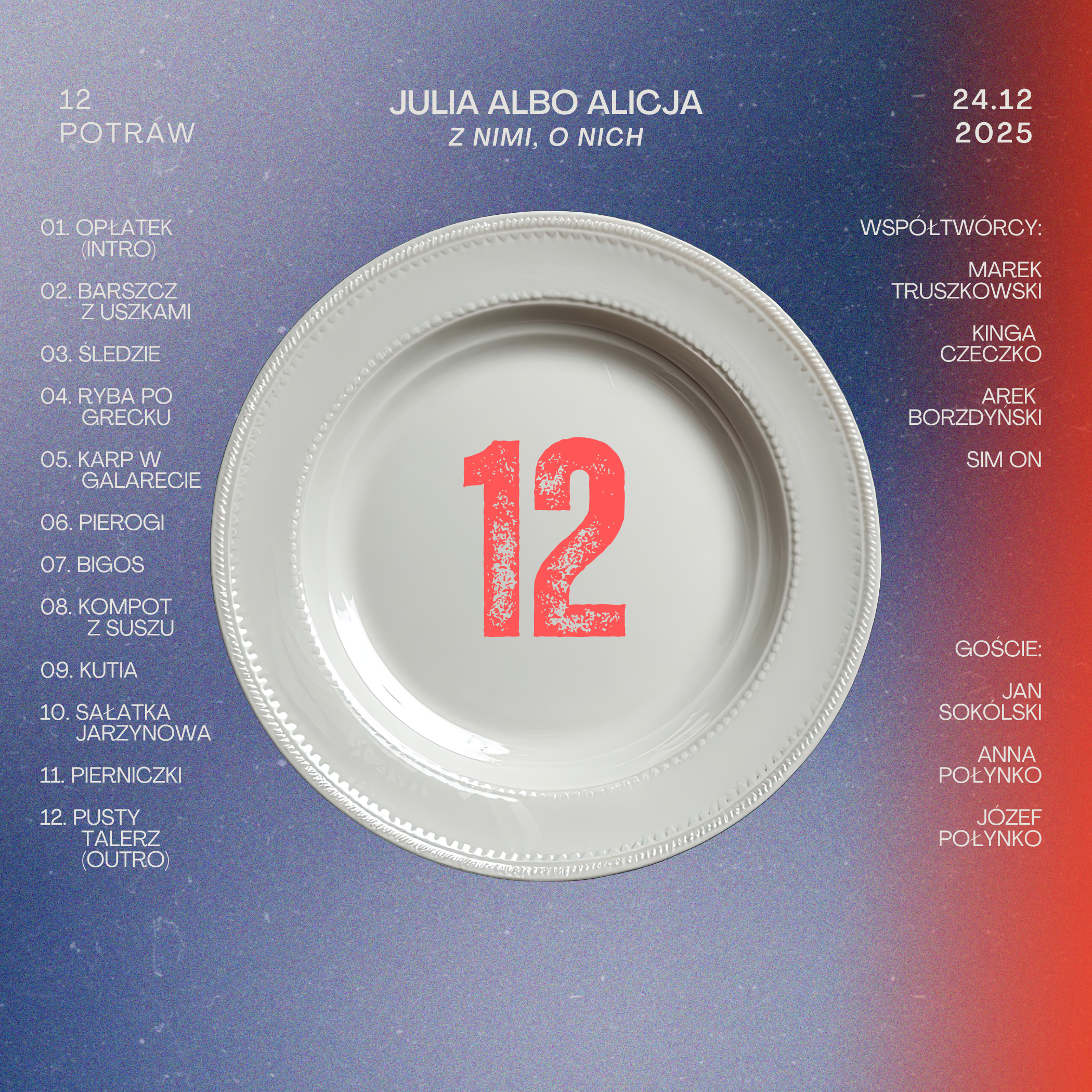 „12” to konceptualny album julii albo alicji (Julii Alicji Połynko), zaplanowany jako seria dwunastu premier publikowanych od 1 do 24 grudnia. Każdy utwór nosi nazwę tradycyjnej wigilijnej potrawy, a cały projekt odwołuje się do idei stopniowo podawanej „muzycznej kolacji”.