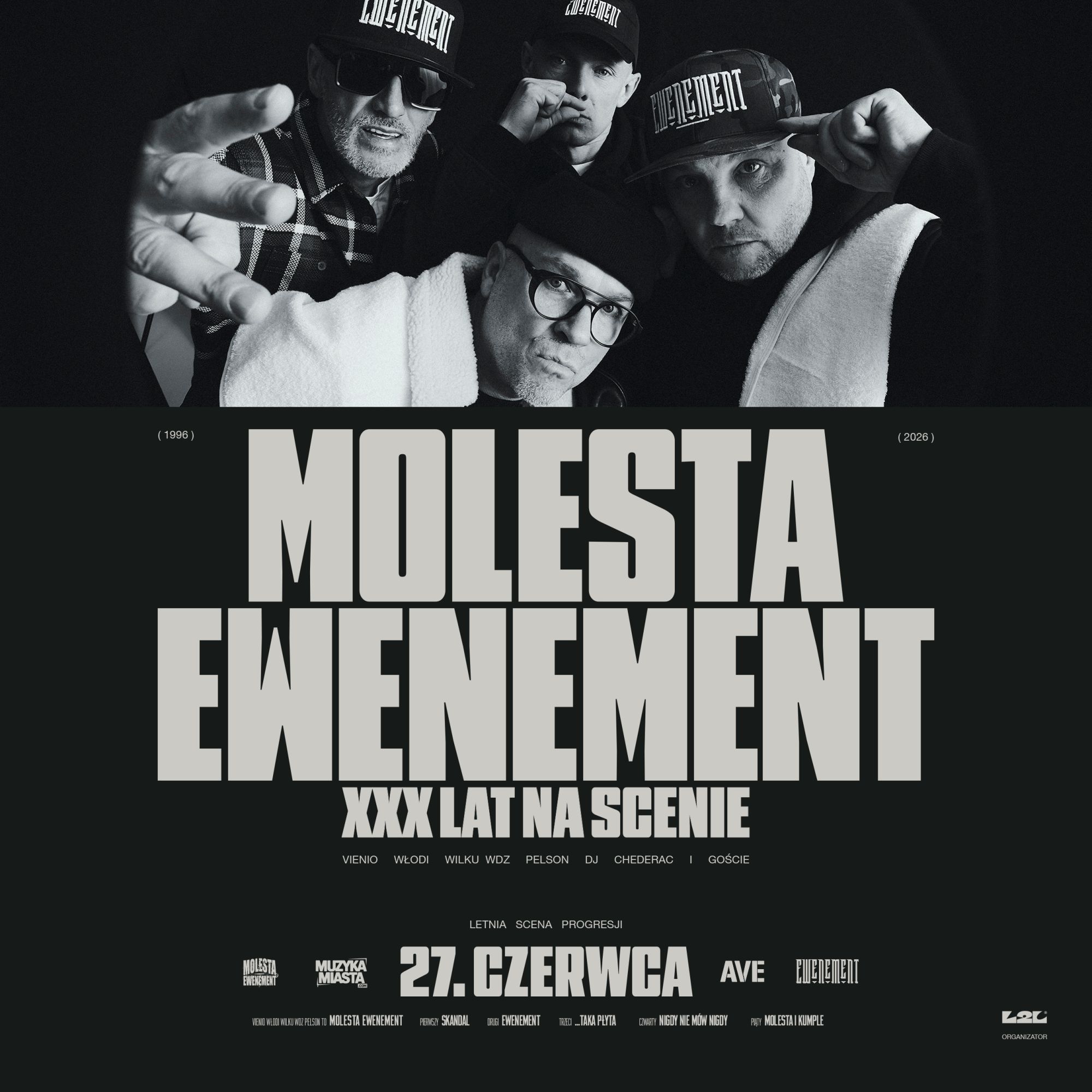 Legendarny warszawski zespół Molesta Ewenement świętuje swoje 30-lecie. Już 27 czerwca Włodi, Vienio, Wilku i Pelson zagrają jeden z najważniejszych koncertów w swoim dorobku, albowiem będzie to podsumowanie aż trzech dekad na hiphopowej scenie. Architekci, współtwórcy i pionierzy polskiego rapu wystąpią na Letniej Scenie Progresji.